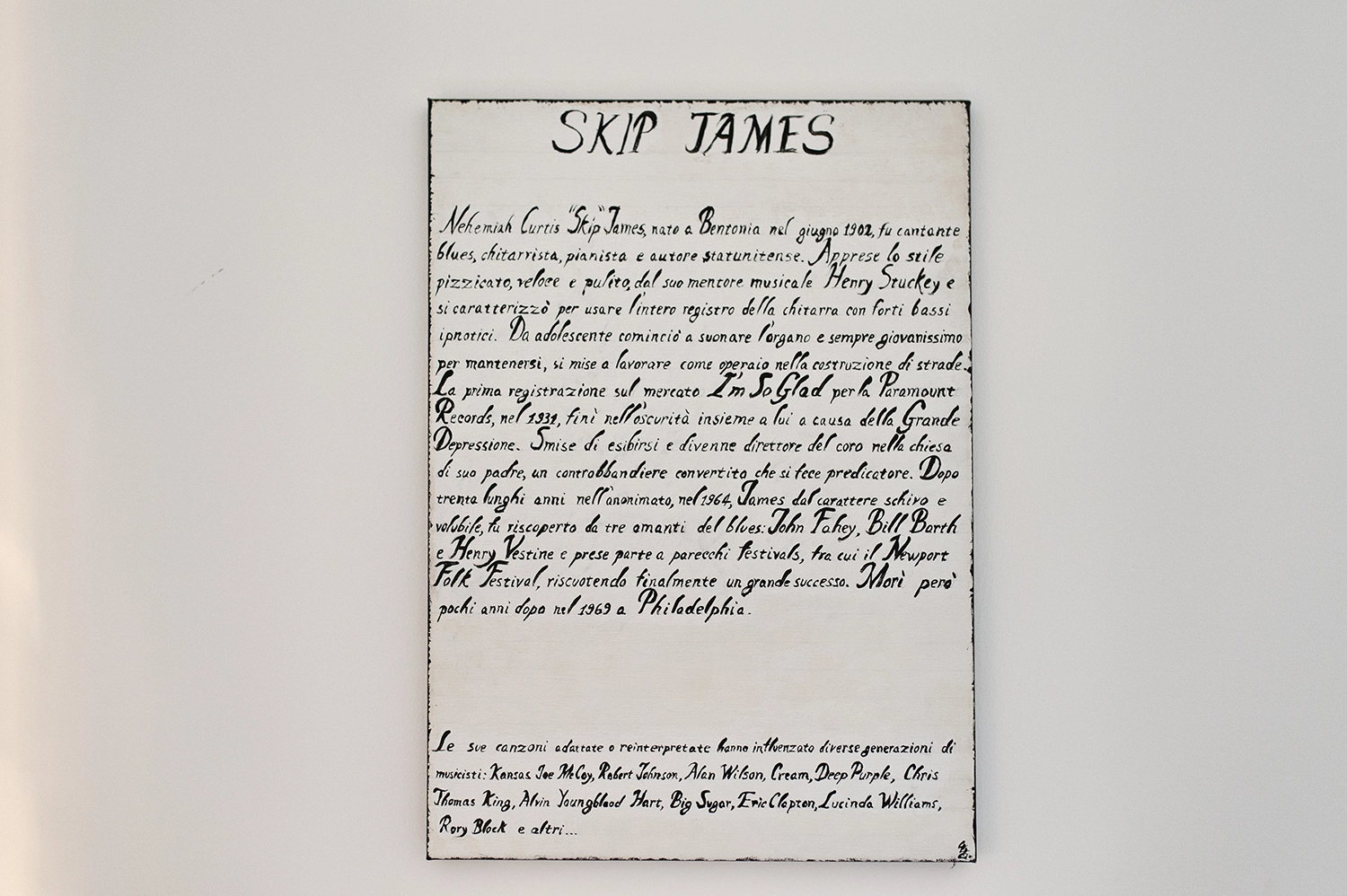 Nehemiah Curtis “Skip” James, nato a Bentonia nel giugno 1902, fu cantante blues, chitarrista, pianista e autore statunitense. Apprese lo stile pizzicato, veloce e pulito, dal suo mentore musicale Henry Stuckey e si caratterizzò per usare l’intero registro della chitarra con forti e ipnotici bassi. Da adolescente cominciò a suonare l’organo e sempre giovanissimo, per mantenersi, si mise a lavorare come operaio nella costruzione di strade. La prima registrazione sul mercato I’m So Glad per la Paramount Records, nel 1931, finì nell’oscurità insieme a lui a causa della Grande Depressione. Smise di esibirsi e divenne direttore del coro nella chiesa di suo padre, un contrabbandiere convertito che si fece predicatore. Dopo trenta lunghi anni nell’anonimato, nel 1964, James dal carattere schivo e volubile, fu riscoperto da tre amanti del blues: John Fahey, Bill Barth e Henry Vestine e prese parte a parecchi festivals, fra cui il Newport Folk Festival, riscuotendo finalmente un grande successo. Morì purtroppo pochi anni dopo nel 1969 a Philadelphia.